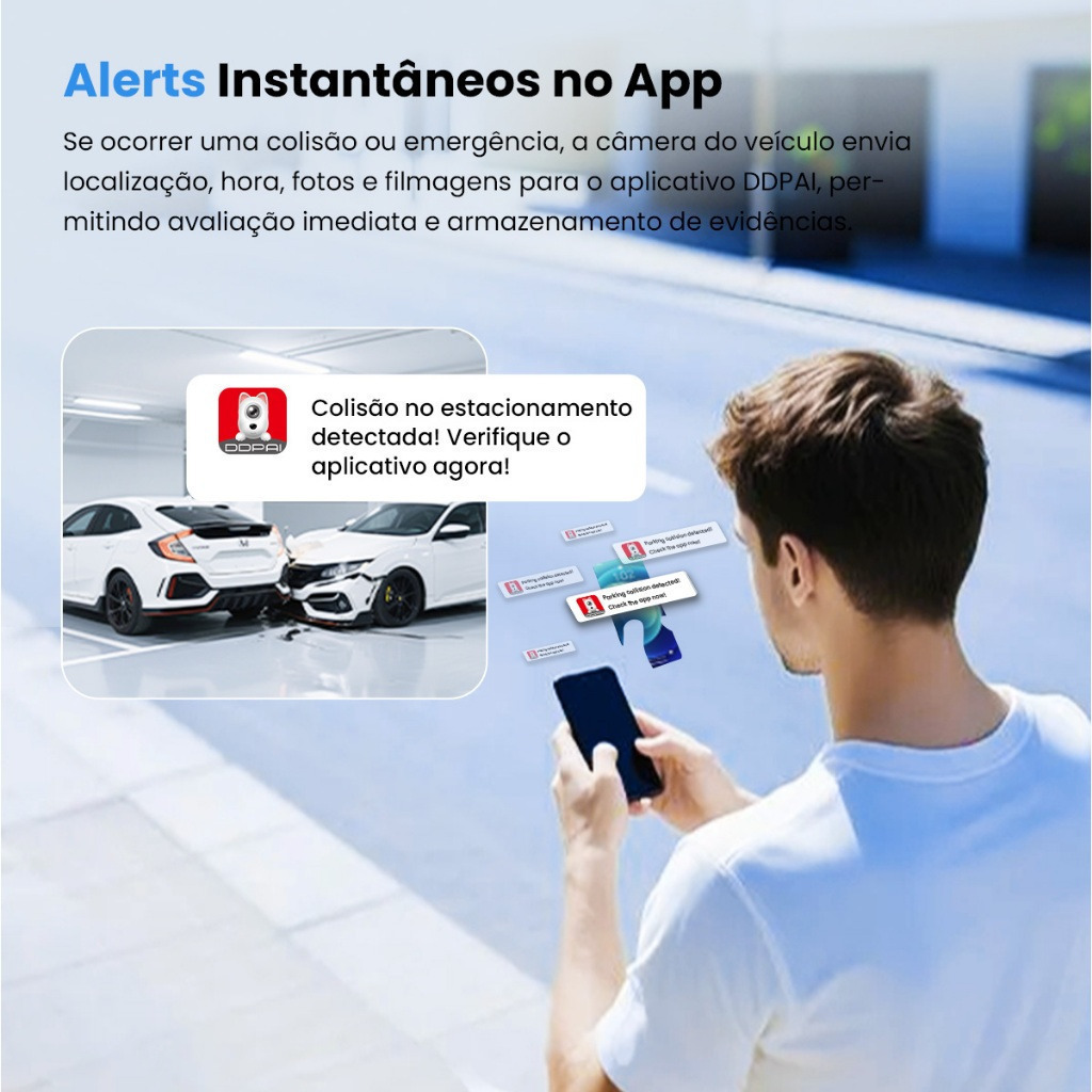 1.Alertas Instantâneos via App: Em caso de colisão, a câmera envia localização, hora, fotos e vídeos diretamente para o aplicativo DDPAI, permitindo avaliação imediata e registro das evidências.